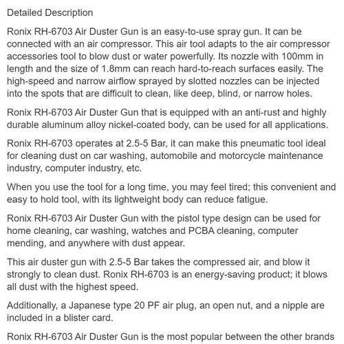 مدل RH-6703، یک تفنگی باد است که در کنار کمپرسور باد قابل استفاده است. این محصول را شرکت «رونیکس» (Ronix) به بازار عرضه میکند. این تفنگی از جنس آلومینیوم ساختهشده و روی آن را با لایهای از فلز نیکل پوشاندهاند. کیفیت و نوع ساخت، باعث جلوگیری از زنگ زدن این مدل میشود. فشار کاری این ابزار 10 بار و حداکثر فشار قابل تحمل آن، 140 بار است. نازل این محصول 75 میلی»تر طول دارد. از تفنگی باد برای باد کردن، تمیز کردن، شستشو با هوا و خشک کردن اجسام مختلف استفاده میکنند. نوع اتصال و خروجی تفنگیهای باد با هم متفاوت هستند. شرکت رونیکس ازجمله عرضهکنندگان مطرح داخلی درزمینهی انواع ابزارهای دستی، بادی و برقی است. این شرکت با معرفی محصولاتی که ازنظر کیفیت در سطح قابلقبولی قرار دارند و تهیهی آنها ازلحاظ قیمت مقرونبهصرفه هستند، جایگاه مناسبی در بازار ایران برای خود ایجاد کرده است.